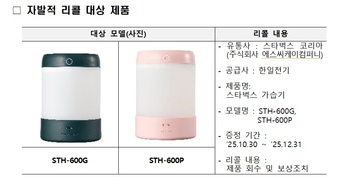 스타벅스 가습기에 대해 정부가 자발적 리콜을 실시하기로 했다.산업통상부 국가기술표준원은 스타벅스 코리아가 소비자에게 증정한 가습기 2개 모델(모델명: STH-600G, STH-600P) 전량에 대해 2월 2일부터 자 ...