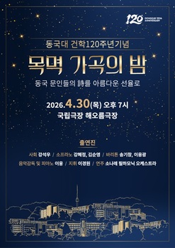 동국대학교가 다음 달 30일 국립극장 해오름극장에서 건학 120주년 기념 '목멱 가곡의 밤'을 연다고 23일 밝혔다.이번 무대는 동국대 출신 문인의 시를 아름다운 가곡으로 재조명하는 자리로 기대를 모은다. 만해 한용 ...