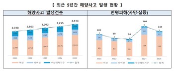 지난해 어선·수상레저 등 해양에서 발생한 사고가 3513건으로 3년 연속 3000건을 넘어섰다. 관련 통계 집계 이후 가장 많은 수준이다. 해양수산부 중앙해양안전심판원이 19일 발표한 '2025년 해양사고 ...