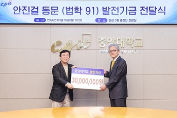 중앙대학교는 최근 안진걸 민생경제연구소장(법학과 91학번)이 학교발전기금 3000만 원을 기부했다고 18일 밝혔다.기금 전달식은 지난 16일 서울캠퍼스 본관(201관)에서 안진걸 소장을 비롯해 박세현 총장, 이무열 ...