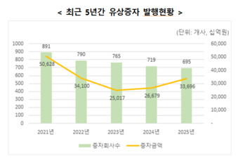 지난해 유상증자는 전년보다 26% 넘게 증가한 반면 무상증자는 25% 감소한 것으로 나타났다. 대형 상장사의 대규모 자금조달이 늘어난 영향으로 유상증자 규모는 확대됐지만, 무상증자는 전반적으로 감소세를 보였다.12일 ...