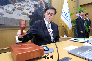 이창용 한국은행 총재가 10일 오전 서울 중구 한국은행 본관에서 열린 금융통화위원회 본회의에서 의사봉을 두드리고 있다. (사진=공동취재단) ...