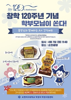 숙명여자대학교가 7일 오전 11시40분 서울 용산구 캠퍼스 내 순헌관 광장에서 창학 120주년 기념 1학기 중간고사 간식 배부 행사를 연다고 밝혔다.이날 문시연 총장을 비롯해 교무위원들이 학생 1200명에게 훈제란과 ...