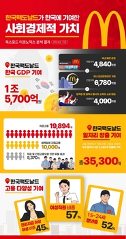 맥도날드가 2024년 한 해 동안 한국 내 비즈니스를 통해 한국 GDP에 약 1조5700억원에 달하는 기여를 한 것으로 분석됐다. 연간 고용 창출 효과는 3만5000명에 달하는 것으로 나타났다.한국맥도날드는 이 같은 ...