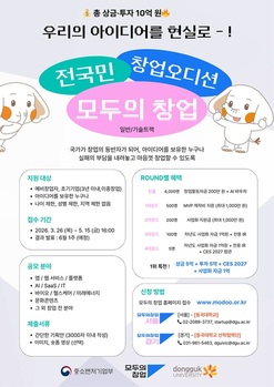 우승 상금과 투자금을 합쳐 총 11억 원에 달하는 창업 지원의 장이 열린다.동국대학교와 동국대 산학협력단은 전 국민 창업오디션 ‘모두의 창업 프로젝트’의 서울·경기 권역 일반·기술트랙 주관기관으로 선정돼 참가자를 모 ...