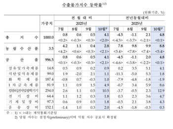 10월 수입물가가 원·달러 환율 상승 영향 등으로 4개월 연속 상승세를 이어갔다.한국은행이 13일 발표한 ‘2025년 10월 수출입물가지수 및 무역지수(잠정)’에 따르면 10월 수입물가(원화기준)는 전월 대비 1.9%, 전년 대비 0.5% 올라 4개월 연속 상승세를 이
