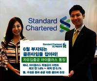 SC제일은행이 예금 고객을 유치하기 위해 순금 10돈을 경품으로 내걸었다.14일 SC제일은행은 마이플러스통장 출시 1주년을 기념해 ‘부자되는 골든타임을 잡아라’ 이벤트를 실시한다고 밝혔다.이번 이벤트는 마이플러스통장을 신규 개설하는 고객 중 추첨을 통해 순금 10돈 골