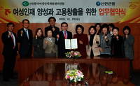신한은행은 23일 신한은행 본점에서 조용병 신한은행장과 조태임 한국여성인력개발센터엽합 회장이 참석한 가운데 여성인재 양성과 고용 창출을 지원하기 위한 전략적 업무협약을 체결했다.이번 협약을 통해 △출산, 육아 등으로 인해 경력이 단절된 여성의 재취업 지원 △여성인력개발