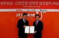 신한은행이 24일 서울 강서구 공항동 소재 제주항공 서울사무소에서 제주항공과 전략적 업무협약을 체결했다.이번 협약을 통해 '신한은행과 함께하는 즐거운 비행'이라는 슬로건으로 늘어나는 자