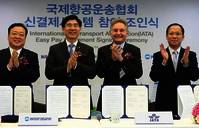 우리은행이 26일 서울 중구 본점에서 대한항공·아시아나항공· 국제항공운송협회(IATA)와 '항공권 신결제시스템' 운영에 참여하는 조인식을 체결했다.국제항공운송협회(IATA)는 각국 민간항공사 운임 결정 및 정산을 위해 설립된 조직체로 130여개국 250여개의 회원 항공