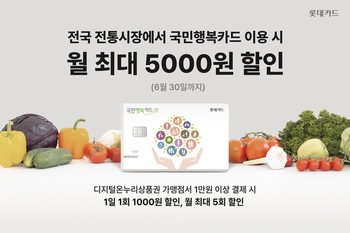 롯데카드가 중소벤처기업부와 함께 오는 6월 30일까지 전국 전통시장에서 월 최대 5000원을 할인해 주는 이벤트를 실시한다고 3일 밝혔다.행사 기간 동안 롯데 국민행복카드(신용·체크)로 전통시장 디지털온누리상품권 가맹점(약 12만점)에서 1만원 이상 결제 시 1000원