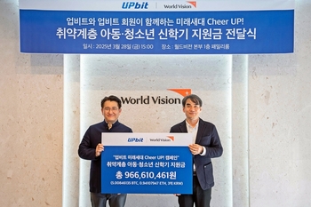 디지털자산거래소 업비트를 운영하는 두나무가 취약가정 아동·청소년들을 위한 ‘미래 세대 Cheer UP!’ 캠페인을 마치고 기부금을 전달했다고 31일 밝혔다.기부금 전달식은 지난 28일 월드비전 본부에서 진행됐으며, 취약가정 아동·청소년들의 새로운 시작을 응원하기 위한
