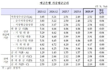 9월 은행 대출금리가 소폭 하락하고 예금금리는 약 1년 만에 상승 전환했다. 이에 따라 대출금리와 예금금리의 격차는 전월보다 좁혀지며 1.51%포인트로 축소됐다.31일 한국은행이 발표한 ‘2025년 9월 금융기관 가중평균금리’에 따르면 예금은행의 신규취급액 기준 저축성