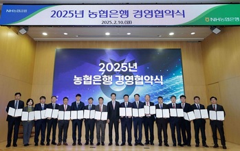 NH농협은행은 10일 서울시 중구 본사에서 강태영 농협은행장과 각 부문장들이 참석한 가운데 '2025년 경영협약'을 체결했다고 밝혔다.이번 협약식에서 농협은행 전 부문은 2025년 추진할 경영목표를 공유했다. 목표 달성을 통해 디지털 전환 가속화, 플랫폼·기업금융·WM