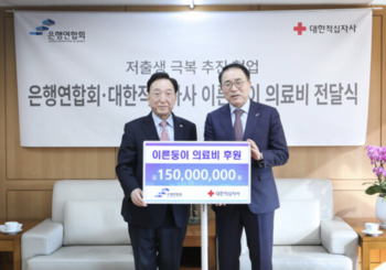 은행연합회는 3일 서울 중구 소재 대한적십자사 서울사무소에 방문해 저출생 극복 사회공헌활동인 ‘이른둥이 의료비 지원 사업(Saving Lives)’을 위한 기부금 1억5000만원을 대한적십자사에 전달했다고 밝혔다.이른둥이 의료비 지원 사업은 출생 직후부터 고난도 수술을