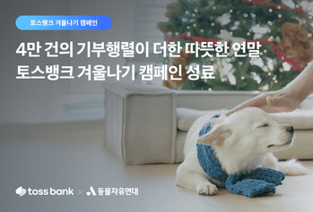 토스뱅크는 일상 속 기부의 가치를 캠페인으로 확장한 ‘토스뱅크 겨울나기 캠페인’이 약 4만 건의 기부 행렬 속에 마무리 됐다고 8일 밝혔다. 토스뱅크는 위기 속 유기동물들의 생명을 구하는 겨울나기 캠페인을 지난해 12월17일부터 31일까지 2주간 진행했다. 이