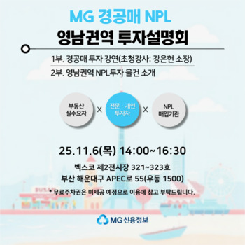 MG신용정보가 내달 6일 부산광역시 우동 벡스코 제2전시장에서 '2025년 경·공매 NPL 영남권역 투자설명회’'를 개최한다고 밝혔다.이번 설명회는 4회차 행사로 개인 및 기관투자자 150명을 대상으로 진행된다.설명회에서는 경·공매에 부실채권(NPL)을 접목해 수익률을