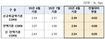 은행권 주택담보대출(주담대) 변동금리의 기준이 되는 자금조달비용지수(COFIX·코픽스)가 8월에도 하락세를 이어갔다.15일 은행연합회에 따르면 8월 신규 취급액 기준 코픽스는 연 2.49%로, 전월(2.51%)보다 0.02%포인트(p) 낮아졌다. 지난해 10월 이후 1