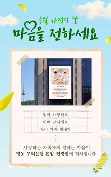 우리은행이 5월 가정의 달을 맞아 사랑하는 가족에게 메시지를 전할 수 있는 감성 캠페인을 선보인다고 7일 밝혔다. ‘마음을 전하세요’ 이벤트를 통해 선정된 고객 사연 150편이 서울 중구 회현동 우리은행 본점 외벽 대형 전광판에 순차적으로 소개된다.이번 이벤트는 부모님