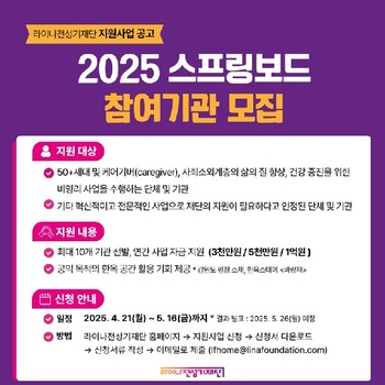 라이나생명의 사회공헌재단인 라이나전성기재단이 시니어와 사회 소외계층을 위한 프로그램을 지원하는 '2025 스프링보드' 지원 사업에 참여 기관을 모집한다고 23일 밝혔다.'스프링보드'는 50+세대 및 돌봄 종사자와 소외계층의 사회적 고립을 해결하고 삶의 질을 향상시키는
