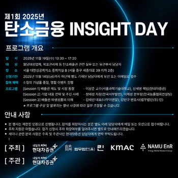 현대차증권은 오는 19일 탄소금융 분야 최신 동향과 인사이트를 공유하기 위해 유관 기업 및 기관의 전문가들이 함께하는 ‘제1회 2025 탄소금융 인사이트 데이’를 개최한다고 12일 밝혔다.참여 대상은 배출권거래제, 목표관리제 등 탄소규제를 적용받는 기업의 실무 또는 유