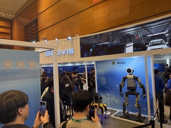 “저게 아틀라스인가봐. 생각보다 엄청 크다.”4일 서울 강남구 코엑스에서 열린 ‘스마트공장·자동화산업전 2026(AW 2026)’ 현대글로비스 부스에는 발 디딜 틈이 없을 정도로 관람객이 몰렸다.화제의 중심에는 보스턴다이내믹스의 휴머노이드 로봇 ‘아틀라스(Atlas)’