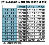 국립대병원들의 의료수익 부익부 빈익빈이 심화되고 있다. 4일 <뉴데일리경제>가 공공기관 경영정보시스템 알리오에 공시된 2014~2016년 국립대학교병원 11곳의 손익계산서를 분석한 결과, 의료 수입 상위 그룹의 수익은 매년 상승하는 모습이다. 의료수
