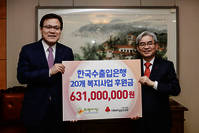 한국수출입은행은 19일 사회복지공동모금회에 총 6억3100만원을 후원했다고 20일 밝혔다. 최종구 수은 행장은 이날 오후 서울 여의도 수은 본점에서 박찬봉 사랑의열매 사무총장을 만나 후원금을 전달했다. 수은이 전달한 후원금은 사랑의열매를 통