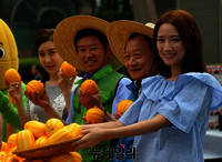 배수동 한국참외생산자협의회 회장(왼쪽에서 3번째)과 모델들이 26일 서울 청계광장에서 열린 농산물직거래장터에서 '농협중앙회 여름맞이 참외할인 프로모션'을 알리고 있다. 농협중앙회는 장터를 방문한 고객을 대상으로 1인당 한 봉지의 참외를 무료 제공하는 이벤트를