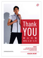 코오롱스포츠는 5월 감사의 달을 맞아 5월 15일까지 '2016 Thank you 페스티벌'을 진행한다고 25일 밝혔다. 기간 중 코오롱스포츠 전국 매장(상설점 제외)에서 진행되며, 20만원 이상 구매 시 반팔 쿨티셔츠를 증정한다. 남/여 각 셔츠, 재킷,