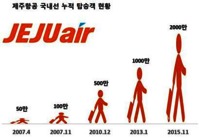 제주항공이 지난 2006년 6월5일 김포~제주 노선에 취항이후 9년 6개월만에 국적 LCC(저가항공사) 중 처음으로 국내선 누적탑승객 2000만명을 돌파했다고 23일 밝혔다.제주항공은 취항이후 10개월만인 2007년 4월 국내선 누적탑승객 50만명 돌파를 시작으로, 2