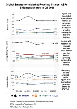 삼성전자가 올해 3분기 글로벌 스마트폰 시장에서 출하량 기준 점유율 1위를 달성했다. 매출 기준으로는 애플이 1위로 나타났다. 7일 시장조사업체 카운터포인트리서치에 따르면 올해 3분기 전 세계 스마트폰 출하량은 전년 대기 4% 증가한 3억2000만대로 집계됐다