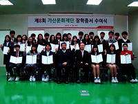가산문화재단은 25일 광동제약 평택 공장에서 제8회 가산문화재단 장학증서 수여식을 가졌다고 26일 밝혔다. 이날 수여식에서는 평택지역을 비롯한 5개 지역의 고등학생 62명에게 9천 3백여 만원의 장학금이 전달됐으며, 가산문화재단 정해영 이사장과 광동