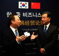 23일 오전 서울 중구 대한상공회의소에서 열린 '한-중 비즈니스포럼'에 앞서 박용만 대한상의 회장을 비롯한 서울상의 회장단과 왕양 중국 부총리가 양국간 경제협력에 대해 환담을 나눴다. 이날 행사에는 왕양 중국 부총리, 박용만 대한상의 회장 등 한·중
