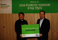 두산매거진은 23일 서울 종로 소재 명휘원에 '2014 두산매거진 자선 바자회' 수익금 3000만원을 전달했다. 이날 전달식엔 명휘원 이현숙 알렉산다 원장수녀와 박용만 두산그룹 회장이 참석했다. 명휘원은 1967년 설립된 사회복지법인으로 장애