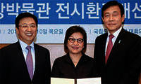 [사진 왼쪽부터 이인용 삼성전자 커뮤니케이션팀 사장, 김영나 국립중앙박물관 관장, 김정태 국립중앙박물관회 회장 ⓒ삼성전자 제공]국립중앙박물관(관장 김영나)은 박물관내 전시실 조명환경 개선을 위해 ㈜삼성전자, 사단법인 국립중앙박물관회와 10일 박물관에서 협약식을