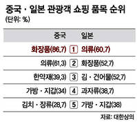 한국을 찾아온 중국인, 일본인 관광객이 가장 자주 찾는 쇼핑장소는 모두 명동을 꼽았다. 대한상공회의소는 8일 한국 관광을 마치고 출국하는 중국인과 일본인 각 150명을 대상으로 쇼핑실태를 조사한 결과, 관광경로와 쇼핑장소, 지불수단 등에서 차이를 보였다고 밝
