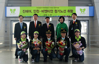 진에어는 지난 28일 인천국제공항에서 취항식을 갖고 자사의 9번째 국제선 정기편인 인천-비엔티안 노선의 운항을 알렸다. 진에어는 이날 인천국제공항 114번 탑승게이트 앞에서 인천-비엔티안 정기 노선 취항식을 갖았다. 진에어는 인천-비엔티안 노선에 183석 규모의 B73