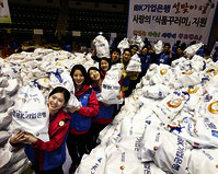 IBK기업은행이 서울 중구 장충체육관에서 8천여개의 식품꾸러미를 만들기 행사를 가졌다고 18일 밝혔다. 설을 맞아 식료품가격 상승으로 어려움에 처한 소외계층을 돕자는 취지인 것. 행사에는 조준희 은행장을 비롯해 기업은행 임직원과 한국사회복지협의회 차흥봉 회장 등 총