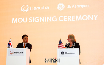 한화에어로스페이스가 미국 GE 에어로스페이스와 함정용 가스터빈 엔진 패키지 국산화 및 공동 개발한다고 21일 밝혔다.지난 20일 경기도 일산 킨텍스에서 진행중인 ADEX 2025 방산 전시회에서 김선 한화에어로스페이스 항공사업부 사업부장, 리타 플래허티 GE 에어로스페