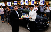 한국지엠이 쉐보레 브랜드 국내 도입 6년 만에 100만대 판매를 돌파했다. 카허 카젬(Kaher Kazem) 한국지엠 사장은 지난 5일 오후 100만번째 차량(말리부)을 구입한 이상범(36세, 서울시 양천구) 고객을 부평 본사로 초청해 차량 전달식을