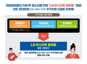 한국토지주택공사(LH)는 국토교통부·보건복지부·여성가족부와 손잡고 자립준비청년과 가정밖 청소년을 위한 '유스타트(Youth+Start)' 3.0 종합지원 방안을 추진한다고 22일 밝혔다.해당프로그램은 사회에 첫발을 내딛는 청년들의 안정적인 주거정착을 돕기 위해 LH가