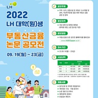 한국토지주택공사(LH)는 부동산금융 분야에 대한 대학(원)생들의 창의적인 아이디어를 발굴하기 위해 '대학(원)생 부동산금융 논문 공모전'을 개최한다고 12일 밝혔다.이번 공모전은 LH와 한국부동산금융투자포럼이 공동으로 주관하며 리츠 등에 대한 일반 국민의 관심도를 높이