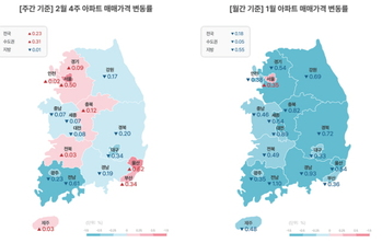 서울 아파트 매매가격이 '강남3구(강남·서초·송파)' 상승세에 힘입어 전주대비 0.11% 올랐다. 수도권 아파트값도 9주만에 상승전환하면서 시장이 본격적인 회복장에 접어든 양상이다.27일 한국부동산원이 발표한 2월 4주 주간 아파트 가격동향에 따르면 전국 매매가격은 -