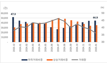 지난달 전국 아파트 하락거래 비중이 45%에 육박하는 것으로 나타났다. 2023년 12월 이후 13개월만에 가장 높은 수치다.10일 직방이 국토교통부 실거래가격을 분석한 결과에 따르면 지난 1월 거래중 44.9%는 종전보다 낮은 가격에 매매되된 것으로 집계됐다.이번 집