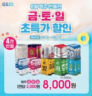 GS25가 8월 한 달 동안 물가 안정 프로젝트를 진행한다고 28일 밝혔다. ‘열정 HIGH’라는 테마로 1500여 상품을 선정해 할인된 가격으로 선보인다.맥주 매출의 성수기인 여름철을 맞아 ‘초특가 맥주 페스티벌’ 행사를 진행할 예정이다. 베이프맥주 4캔 5000원,