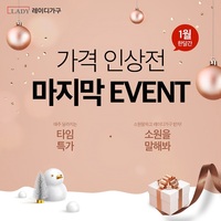 ◇ 레이디가구, 새해맞이 특가 프로모션레이디가구가 새해를 맞이해 1월 한 달 동안 공식 홈페이지에서 특가 프로모션을 진행한다. 제품 가격 인상을 앞두고 시행하는 특가 행사다. 원자재 가격 상승과 물가 인상 등 대내외적 여건에 따라 다음 달 1일 가격인상이 예정