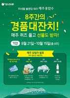 ◇오리온 제주용암수 '8주간의 경품 대잔치' 경품이벤트오리온은 오는 10월15일까지 총 8주간에 걸쳐 퀴즈를 맞히면 오리온 제주용암수, 과자선물세트 및 제주도 왕복항공권과 렌터카 이용권 등을 제공하는 8주간의 경품 대잔치 이벤트를 실시한다.이벤트 참여 방법은 지역마트