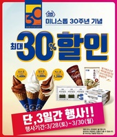 미니스톱이 창사 30주년을 맞아 올 한 해 동안 다양한 연중 프로모션을 진행한다.미니스톱은 매월 28~30일까지 치킨, 소프트크림, 도시락, PB상품 등 대표상품을 대상으로 다양한 할인행사를 진행한다고 27일 밝혔다. 올 한 해 두 번의 대규모 감사할인 행사와