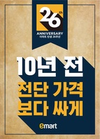이마트가 지난 2일 ‘쓱데이’로 포문을 연 대형 할인행사를 ‘개점 26주년 기념 행사’를 통해 4주간 이어간다고 3일 밝혔다.이번 개점 26주년 기념행사의 테마는 ‘10년전 전단 가격보다 싸게!’다.10년전 개점기념 행사로 3400원에 팔았던 짜파게티를 올해는 3380